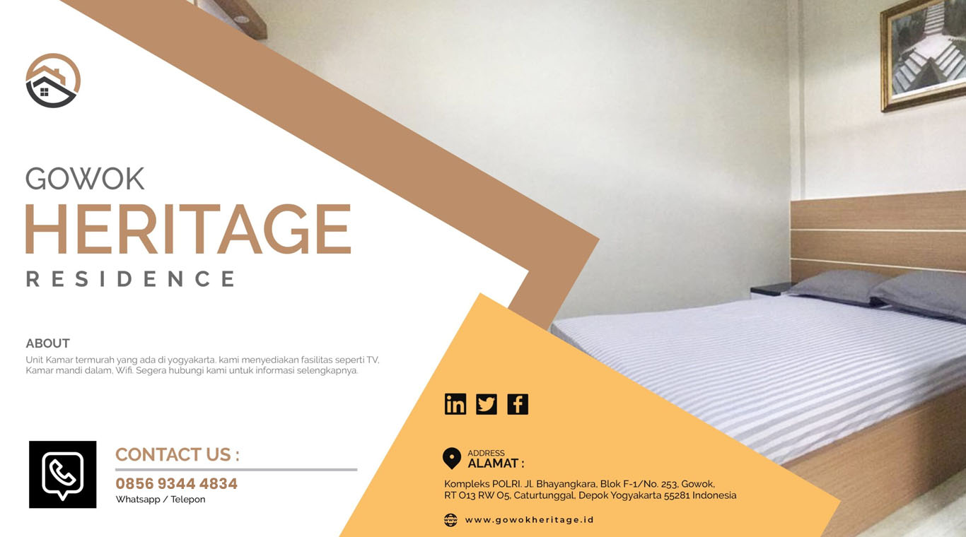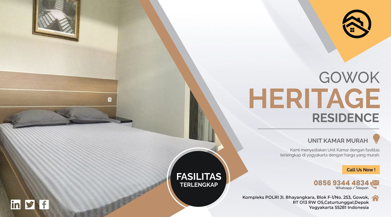 Gowok Heritage Residence merupakan Unit Kamar yang berada di Yogyakarta. Kami menyediakan kamar untuk anda yang sedang mencari unit kamar dengan harga yang murah dan fasilitas lengkap.